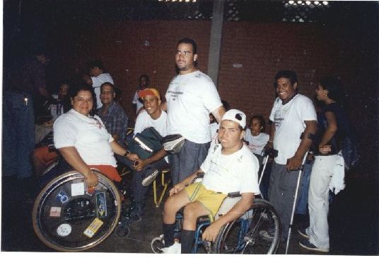 Descripción : Fotografia em cores onde é possível visualizar no centro da imagem um homem e uma mulher em suas cadeiras de roda e entre eles outro homem. No fundo da imagem é possível ver mais pessoas, inclusive um homem de muletas e ao seu lado uma mulher. No verso da foto consta um adesivo da ASCOM com as seguintes informações: “Assessoria de COM SOCIAL – UFPE; Nome: NEFD - PRONID; Evento/Pessoa: Deficientes praticando esportes; Fotógrafo: Passarinho”.