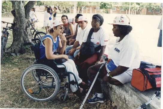 Descrição: Fotografia em cores onde é possível visualizar um grupo de pessoas conversando, em uma área externa do NEFD. No verso da fotografia constam as seguintes informações “Assessoria de COM SOCIAL – UFPE; Nome: Ed Física e Desporto; Evento/Pessoa: Pronid; Fotógrafo: Maurício Coutinho”; Nov. 2000.”