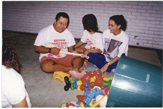 Descripción : Fotografia em cores onde é possível visualizar um jovem com Síndrome de Down em momento de descontração, enquanto toca uma guitarra de brinquedo, junto a uma personalidade não identificada, no interior de um prédio do NEFD. No verso da fotografia constam as seguintes informações “Assessoria de COM SOCIAL – UFPE; Nome: NEFD - PRONID; Evento/Pessoa: Deficientes praticando esportes; Fotógrafo: Passarinho”.