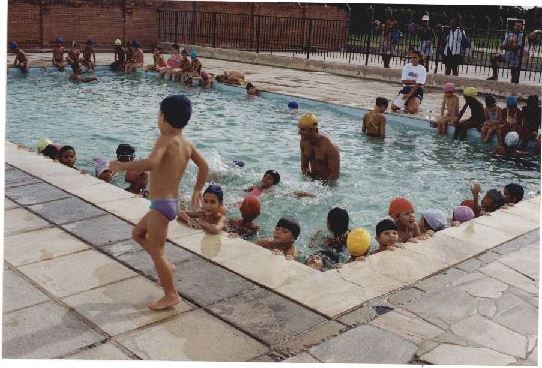 Descrição: Fotografia em cores onde é possível visualizar um grupo grande de crianças participando de uma aula na piscina. No verso da fotografia constam as seguintes informações “Envelope 25437.