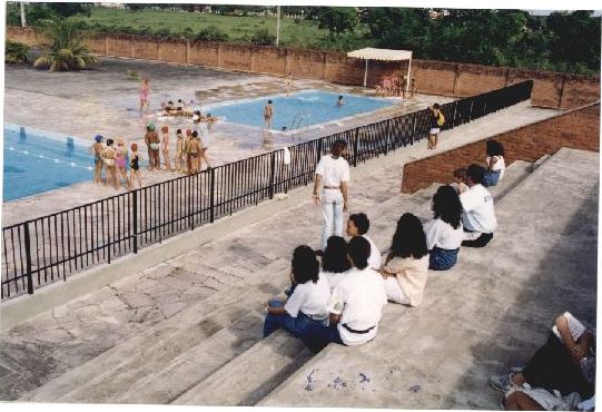 Descrição: Fotografia em cores onde é possível visualizar pessoas em uma arquibancada do NEFD, bem com crianças próximo a duas piscinas. No verso da foto consta a seguinte informação escrita à caneta: “envelope 007293; Assessoria de COM Social – UFPE; Nome: Esportes p/ comunidades; Evento/Pessoa: (Núc. Ed. Fís); Fotógrafo: Maurício Coutinho”.