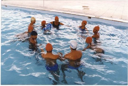 Descrição: Fotografia em cores onde é possível visualizar um grupo de pessoas dentro de uma piscina. No verso das fotos consta um adesivo da ASCOM com as seguintes informações: “Assessoria de COM SOCIAL – UFPE; Nome: NEFD - PRONID; Evento/Pessoa: Deficientes praticando esportes; Fotógrafo: Passarinho”.