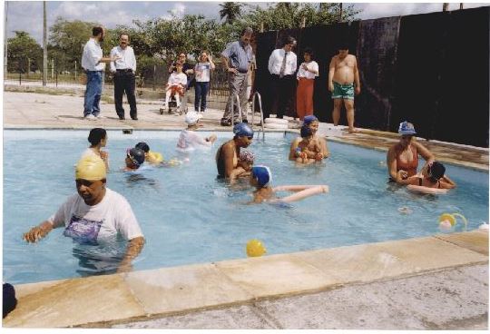 Descripción : | Fotografia em cores onde é possível visualizar uma aula para crianças na piscina, onde elas estão sendo acompanhadas por adultos. Fora da piscina, visualizam-se personalidades não identificadas, e junto a elas o Reitor Mozart Neves Ramos. |