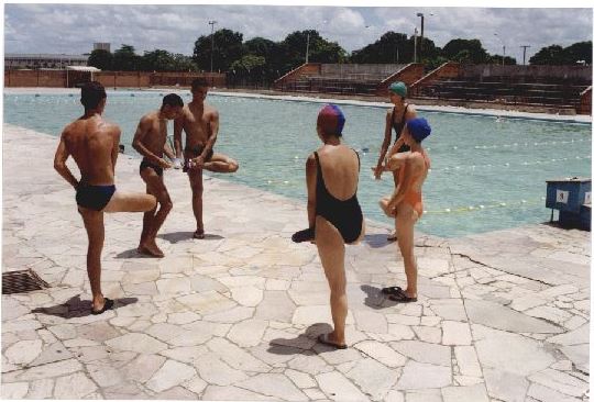 Descrição: | Fotografia em cores onde é possível visualizar um grupo de pessoas com trajes de banho se alongando ao lado de uma piscina. |