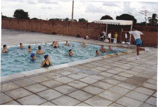 Descrição: | Fotografia em cores onde é possível visualizar uma aula de hidroginástica sendo realizada em uma piscina do NEFD. |