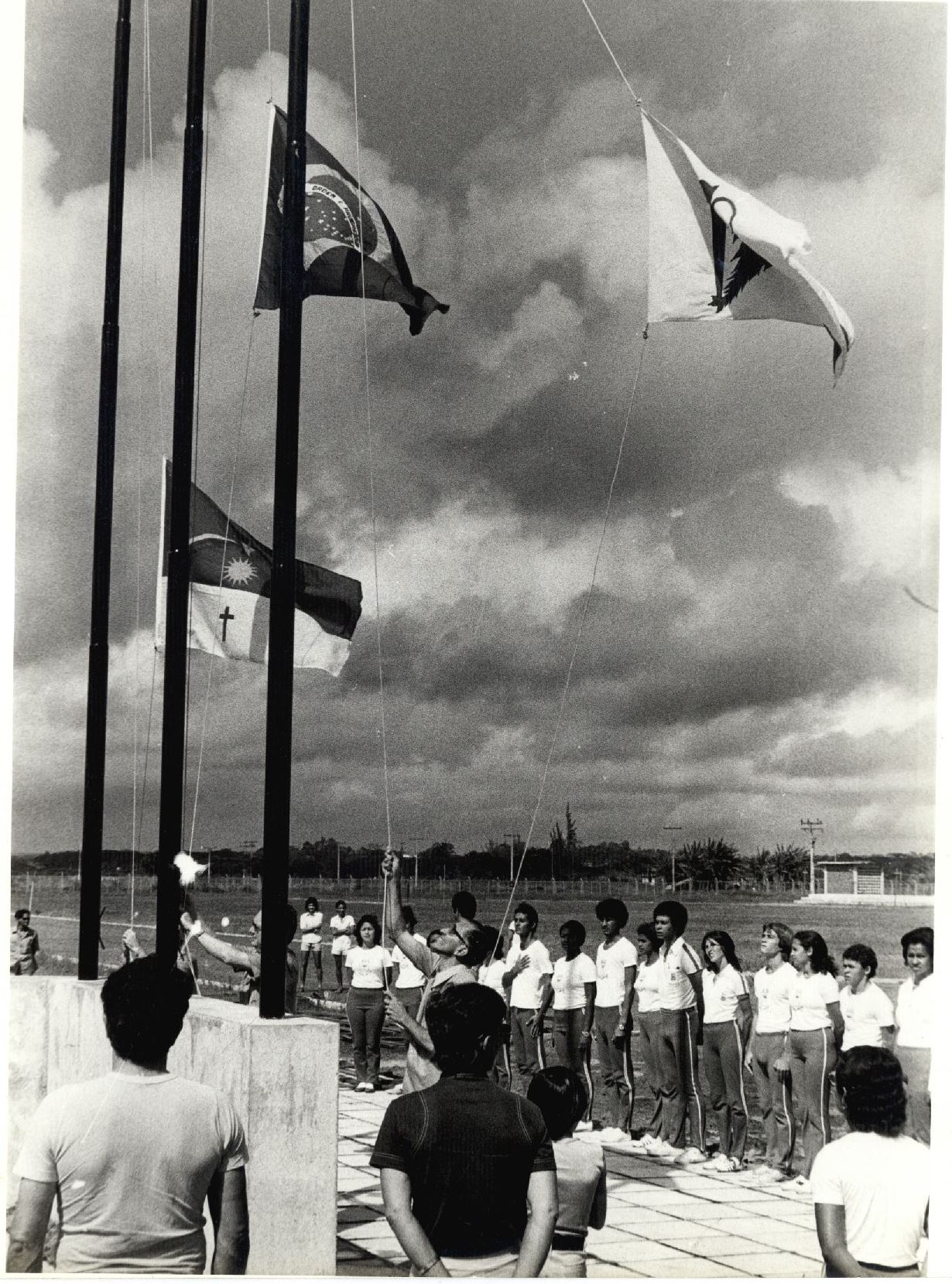 Description: Fotografia em preto e branco do momento de hasteamento da bandeira do Brasil e a de Pernambuco. No verso da fotografia constam as seguintes informações à caneta preenchendo lacunas de um carimbo "Centro Esportivo; Torneio Início - 28º Aniv.; Hasteamento dos pavilhões; 10 Ago 1974".