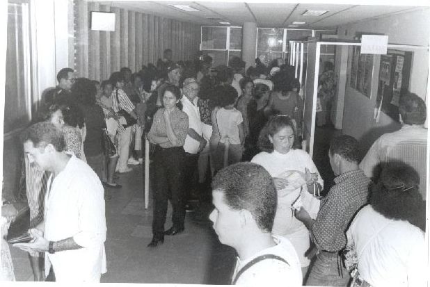 Descrição: | Fotografia em preto e branco onde é possível visualizar um grande número de pessoas reunidas em aparentes filas, no setor identificado como “Setor do SPA”. No verso da foto consta a seguinte informação escrita à caneta: “HC, setor do SPA”. |