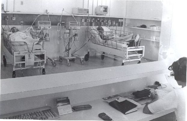Descrição: | Fotografia em preto e branco onde é possível visualizar duas personalidades não identificadas internadas na UTI do Hospital das Clínicas, ambos sendo monitorados através de um vidro que separa o quarto de uma sala de monitoramento. No verso da foto consta a seguinte informação escrita à caneta: “04-10; larg – 9; alt – 6.5”. |