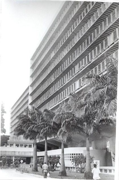 Descrição: | Fotografia em preto e branco onde é possível ter uma visualização da fachada do Hospital das Clínicas. |