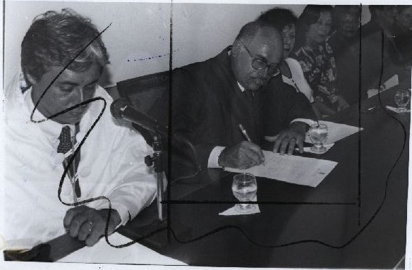 Descrição: | Fotografia em preto e branco onde é possível visualizar personalidades sentadas à mesa do evento de posse da nova diretoria do Centro de Educação, dentre elas está o Reitor Mozart Neves Ramos. No verso da foto consta a seguinte informação escrita à caneta: “Posse da nova diretoria do CE/97; 03-20; larg – 5.5; Alt – 5.5”. |