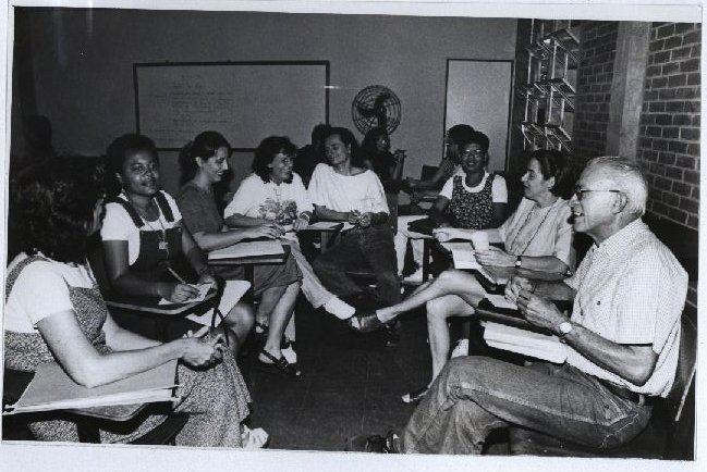 Descrição: | Fotografia em preto e branco de algumas pessoas, sentadas em carteiras, dentro da sala de aula do CE. |