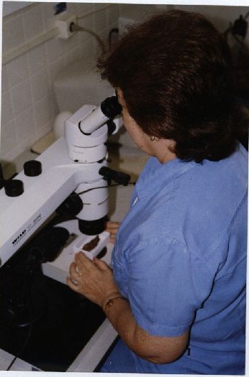 Descrição: Fotografia em cores de mulher não identificada utilizando um microscópio. No verso das fotos consta um carimbo ASCOM com as seguintes informações: “ASSESSORIA DE COM SOCIAL – UFPE; Nome: CCB – Lab.; Evento/Pessoa: Fungos; Fotógrafo: Mila Targino; Jan 2002”