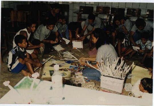 Descrição: | Fotografia em cores onde é possível visualizar um círculo de crianças sentadas no chão em uma sala de aula. No centro do círculo estão duas mulheres não identificadas e materiais escolares, além de uma caixa com artesanato feito com materiais recicláveis.No verso da foto consta um adesivo da ASCOM com a seguinte informação: “Assessoria de Com. Social – UFPE 05/05/04; Nome: CCB; Evento/Pessoa: Projeto Ambiental de Cortês; Fotógrafo: Maurício Coutinho”. |