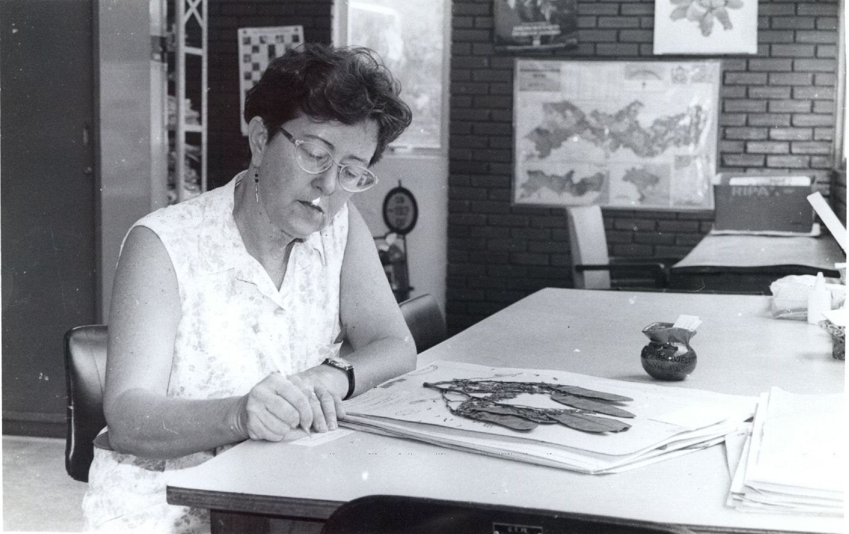 Descrição: | Fotografia em preto e branco onde aparece a professora Marlene Barbosa sentada à mesa enquanto escreve. Na mesa estão papéis e um vaso. No fundo da imagem aparecem alguns mapas e quadros na parede. No verso da foto consta a seguinte informação escrita à caneta: “Herbário da UFPE; Prof. Marlene Barbosa; Novembro/98; Foto: Francisco Paiva”. |