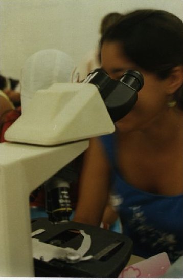 Descrição: Fotografia em cores de aluna utilizando um microscópio em laboratório