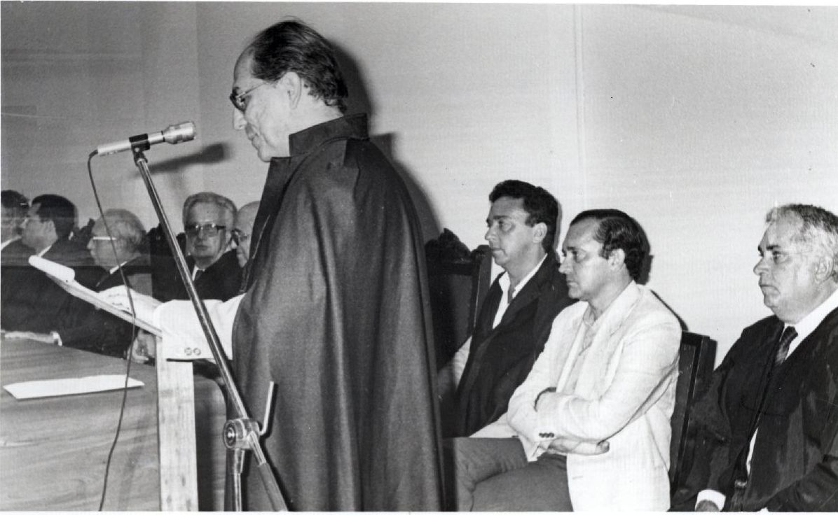 Descrição: | Fotografia em preto e branco onde é possível visualizar diversas personalidades em um evento, uma delas em momento de fala ao microfone. |