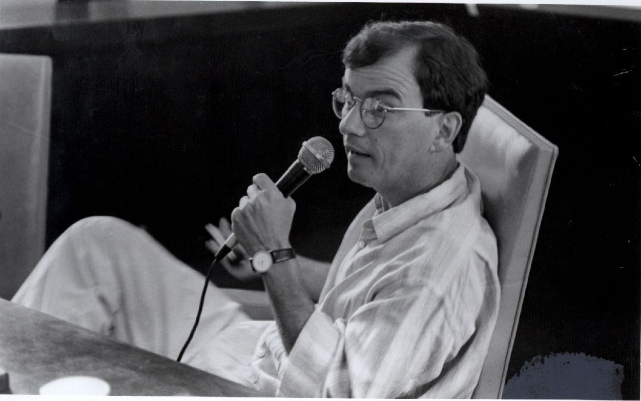 Descrição: Fotografia em preto e branco onde é possível visualizar uma personalidade não identificada em momento de fala ao microfone.