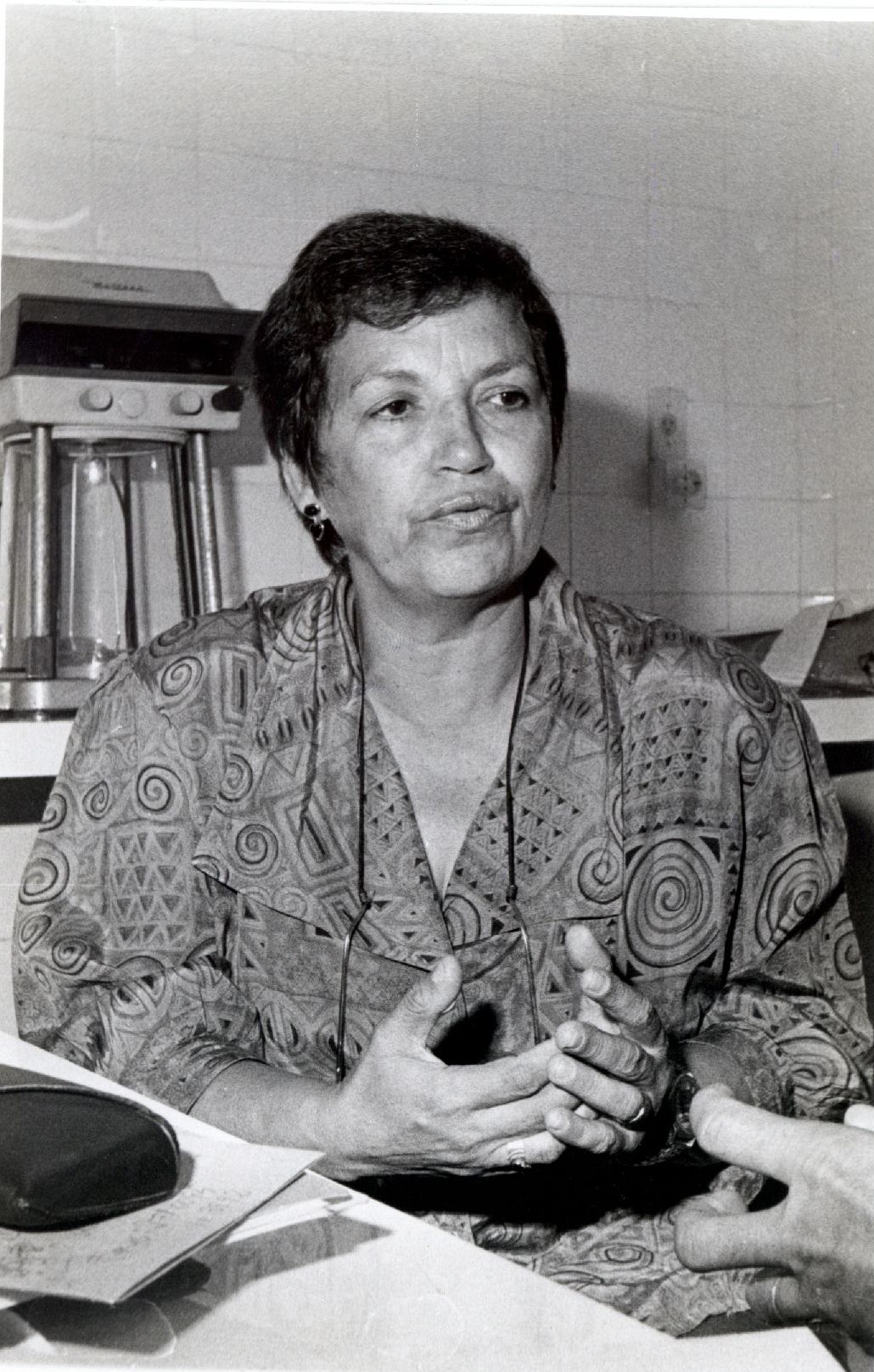 Descrição: Fotografia em preto e branco onde é possível visualizar a Professora Valdinete Lins da Silva, do Departamento de Engenharia Química da UFPE. Informações encontradas no verso da fotografia “centro de C. Biologia, Profº Valdinete Lins da Silva, do departamento de engenharia química da UFPE, fev-32, fotógrafo- Mauricio Coutinho”.