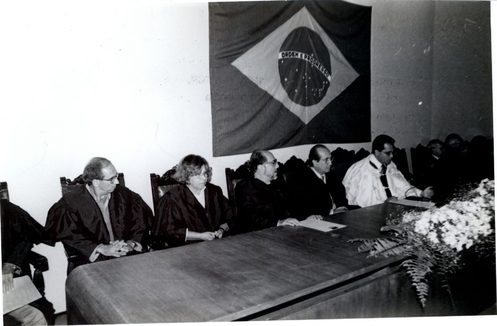 Descrição: Fotografia em preto e branco onde é possível visualizar diversas personalidades compondo a mesa diretiva de um evento, dentre elas o Reitor Éfrem Maranhão. Informações encontradas no verso da fotografia: "Centro de Ciências Biológicas, assunto: posse da diretoria e vice, auditório: Centro de Tecnologia, mês: maio/92, fotográfico: Passarinho.”