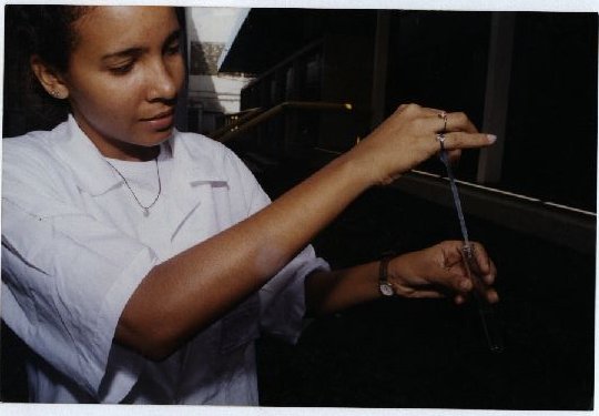 Descrição: Fotografia em cores onde é possível visualizar uma personalidade não identificada no interior de um aparente laboratório; a mesma tem em suas mãos um tubo de ensaio e veste jaleco. Informações encontradas no verso da fotografia: à caneta na etiqueta adesiva da ASCOM "CCB; [?]; Mar/2002".