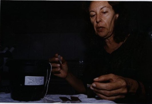 Descrição: Fotografia em cores onde é possível visualizar uma personalidade identificada como Cleyde Albuquerque no interior de um aparente laboratório, onde é possível visualizar inda um microscópio, objetos não identificados e um pequeno vaso preto. Informações encontradas no verso da fotografia: à caneta na etiqueta adesiva da ASCOM "Depto. Zoologia; Pessoa: Cleyde Albuquerque; Fotógrafo: Bárbara Wagner".