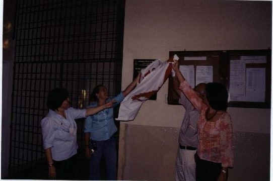 Descrição: | Fotografia em cores onde é possível visualizar quatro pessoas no momento de descerramento de uma placa de inauguração. |
