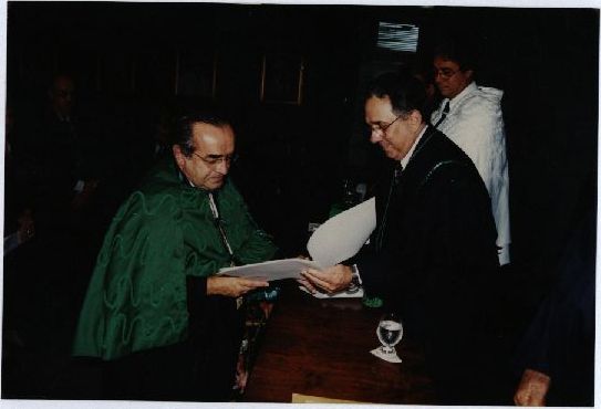 Descrição: | Fotografia em cores onde é possível visualizar o professor Carlos Médicis Morel próximo a mesa de honra do evento no qual ele recebeu o título de Honoris Causa, em março de 2001. No verso da foto consta a seguinte informação escrita à caneta: “CCS – Prof. Carlos Médicis Morel; Honoris Causa – Gabinete; Passarinho – Março 2001”. |