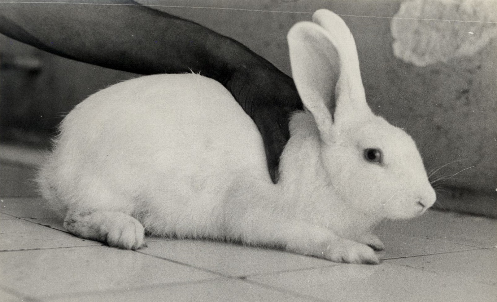 Descrição: Fotografia em preto e branco. Uma mão masculina segura um coelho branco sobre um piso de cerâmica.