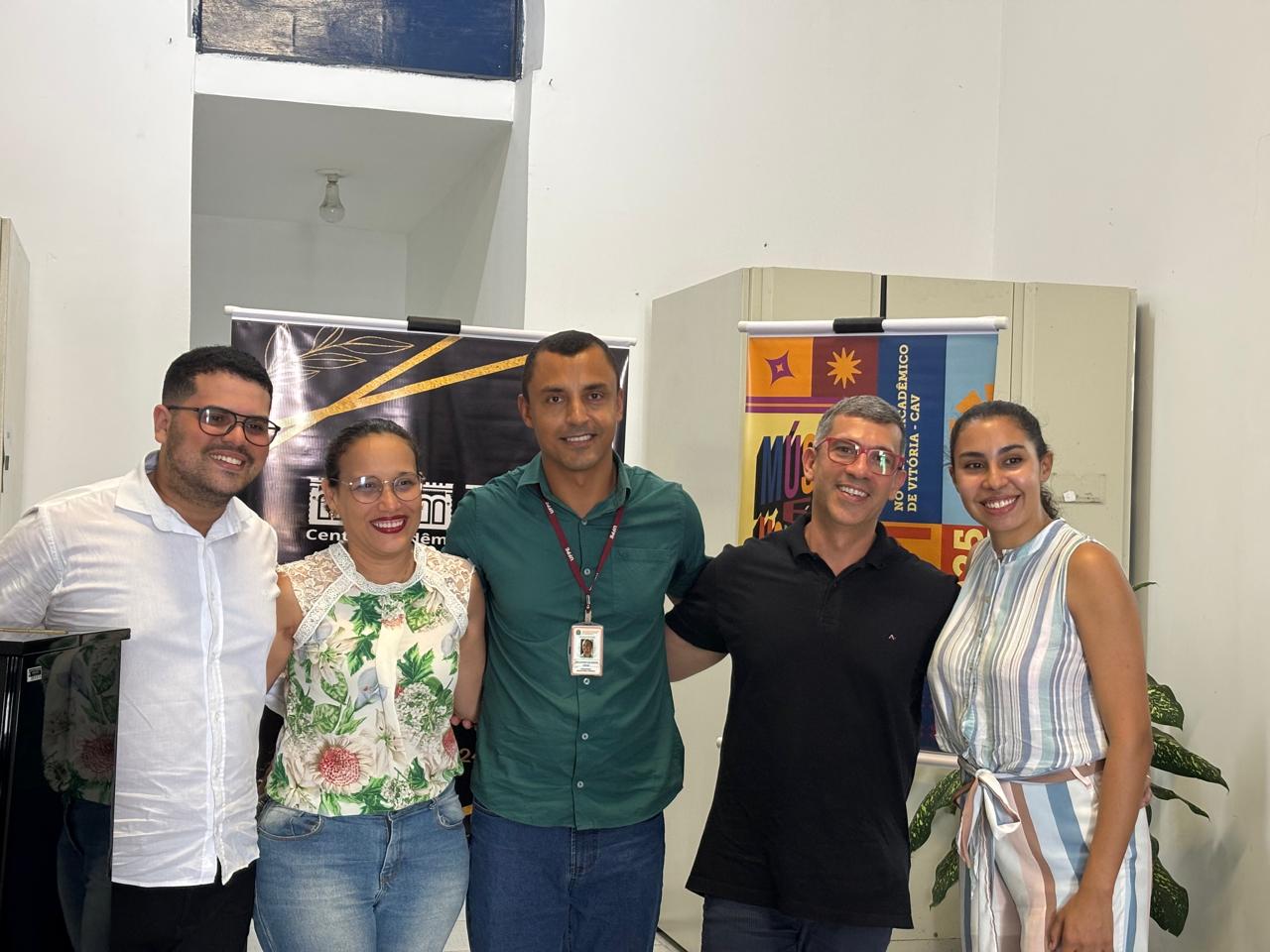 Descrição: Projeto música em movimento no Centro Acadêmico de Vitória, da esquerda para direita: Igor Monteiro, Michelle Galindo de Oliveira (Vice-Diretora do CAV), José Antônio dos Santos (Diretor do CAV), Antonio Nigro (coordenador do projeto) e Luana Espíndola.